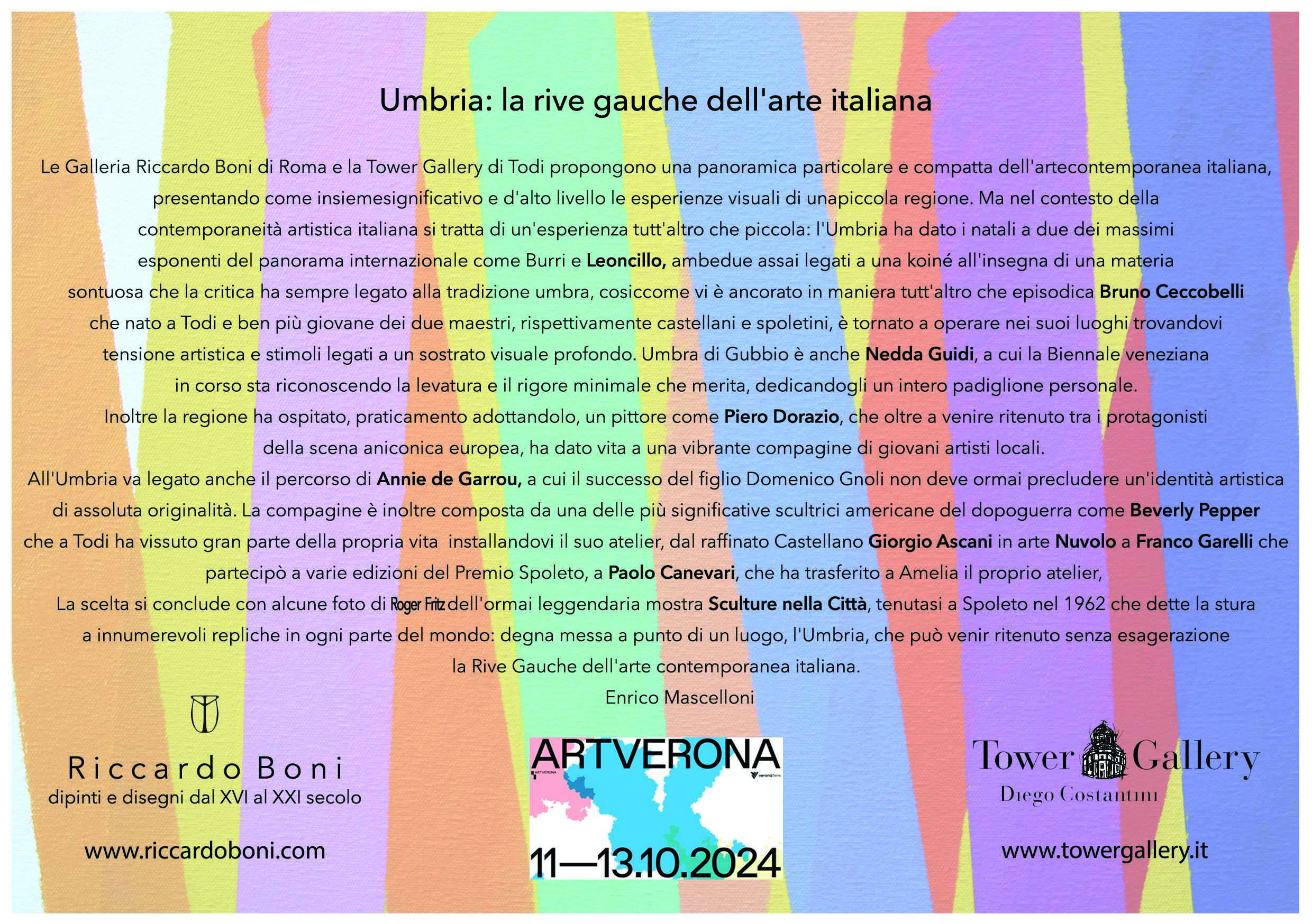 dall'ormai consolidata collaborazione con la Tower Gallery di Todi, nasce il nuovo progetto a cura di Enrico Mascelloni "Umbria, la rive gauche dell'arte italiana" che presentermo ad ArtVerona 2024 - l'Umbria come luogo di nascita o di approdo di un numeroso gruppo di artisti fondamentali per l'arte italiana del secondo dopoguerra. Leoncillo, Nedda Guidi, Piero Dorazio, Beverly Pepper, Nuvolo sono alcuni degli artisti presentati.