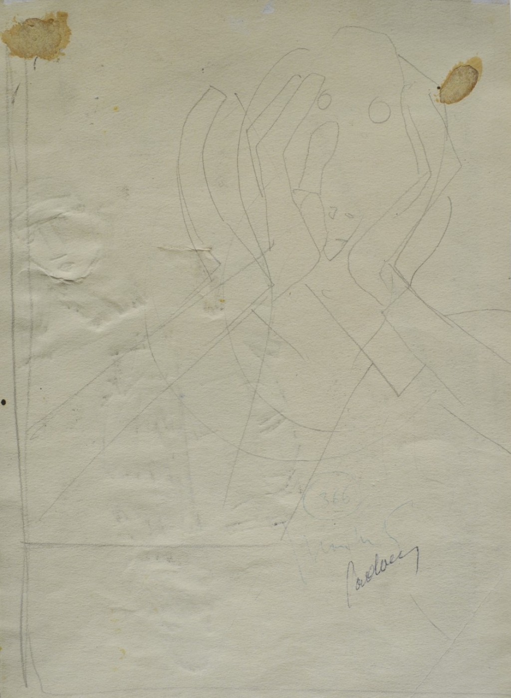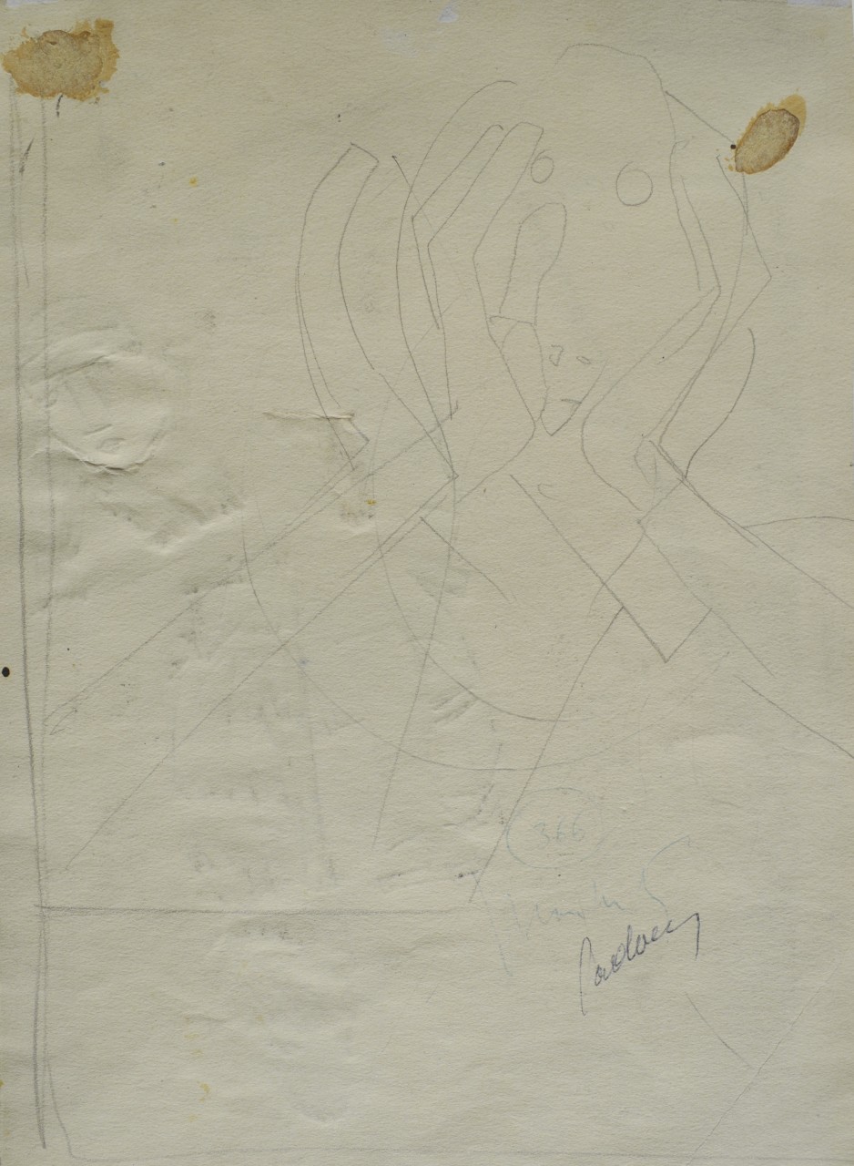 a retro: schizzo a matita di uomo che urla, possibile disegno per un'illustrazione non identificata; numero d'inventario dell'eredità Sironi n.316 e firme dei Notai redattori Cadario e Macchiati.