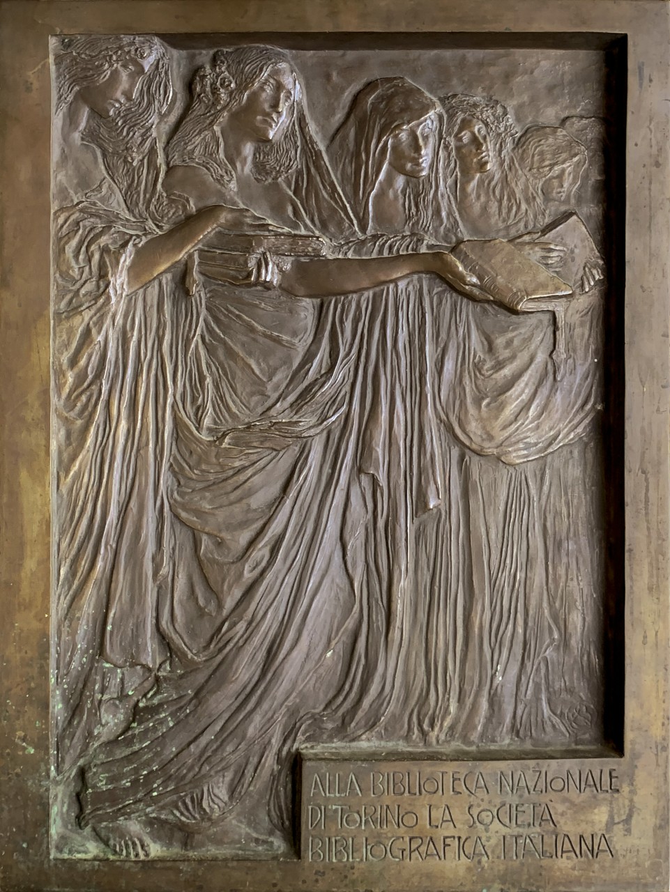 Nel 1905 la Società Bibliografica Italiana commissionò a Leonardo Bistolfi una targa in bronzo per commemorare il terribile incendio che aveva danneggiato la Biblioteca Nazionale di Torino l'anno precedente.